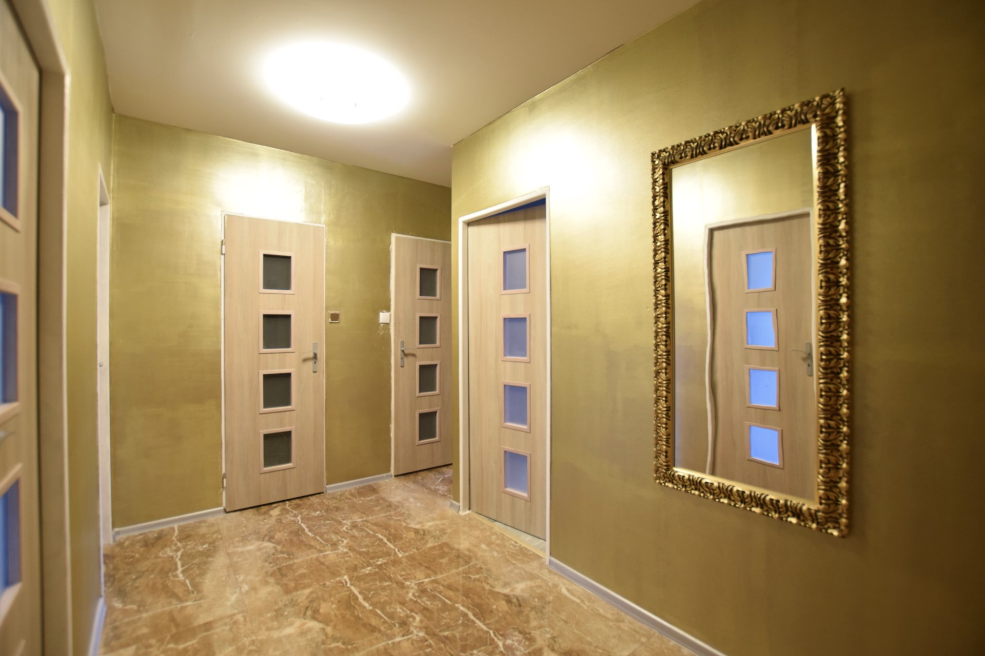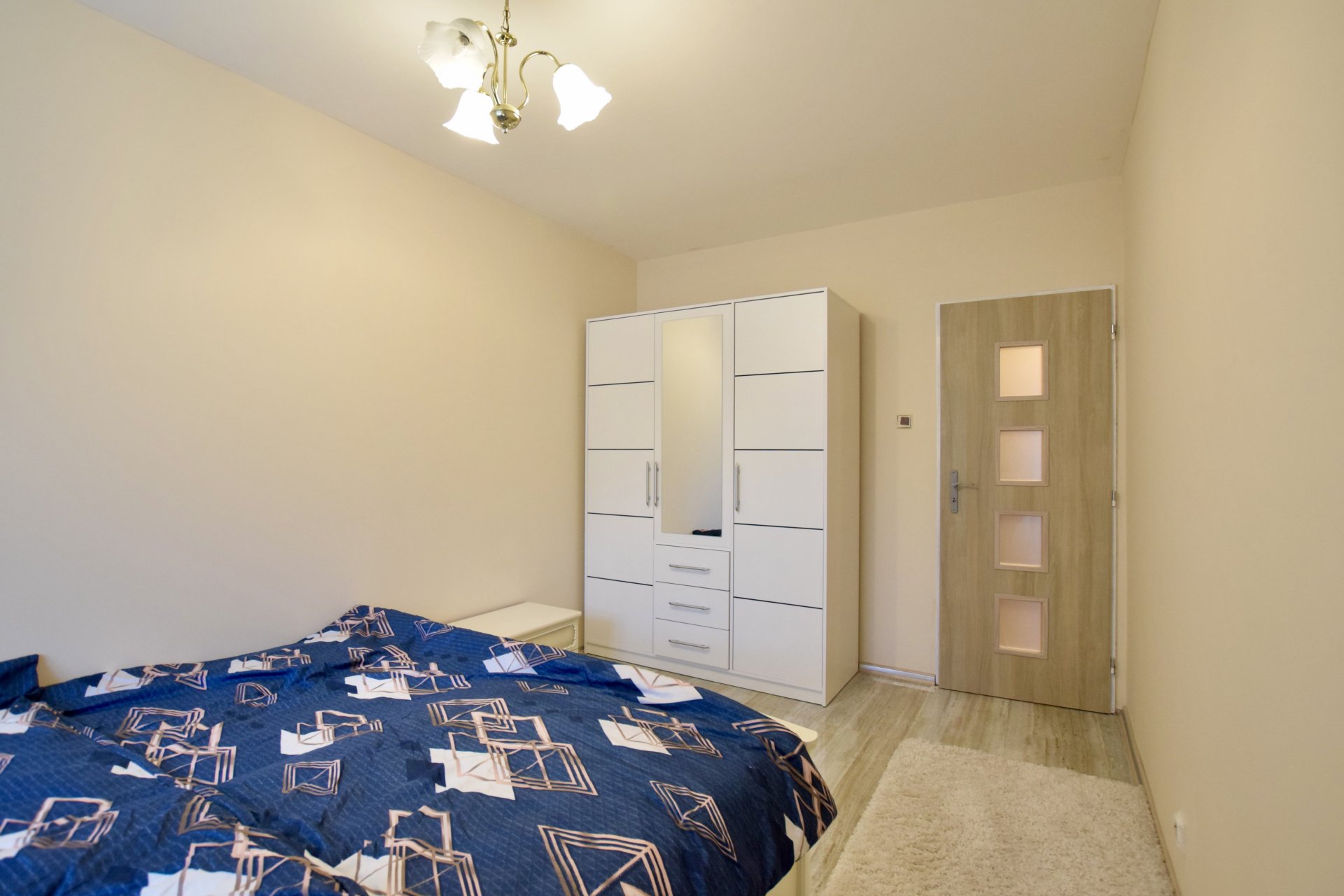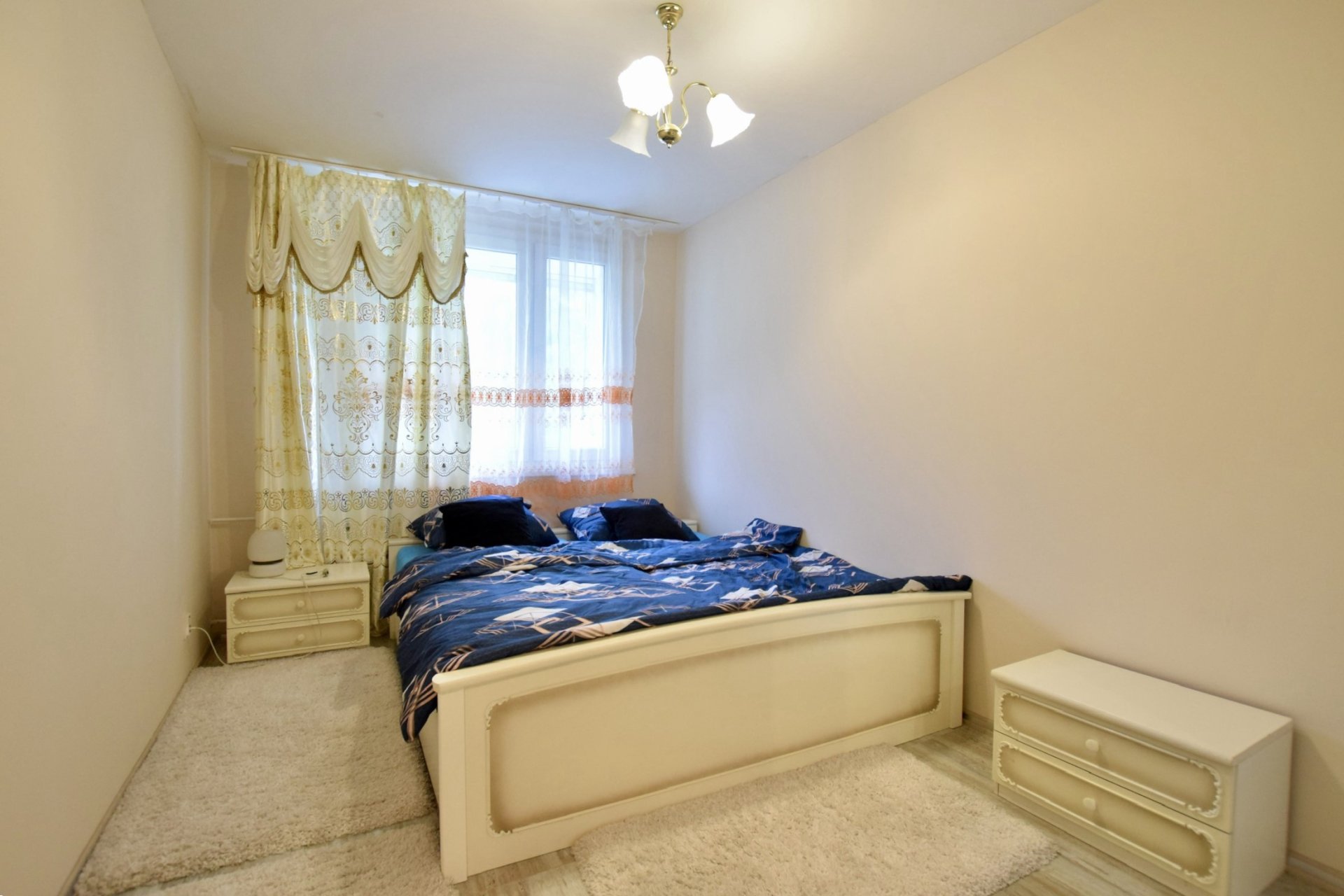 Dispozice bytu nabízí obývací pokoj, dvě samostatné ložnice a oddělenou kuchyni. Kuchyně je vybavena mikrovlnnou troubou, lednicí, pračkou a sporákem s digestoří. Koupelna je vybavena vanou a byt poskytuje praktické a funkční uspořádání místností s dostatkem prostoru.