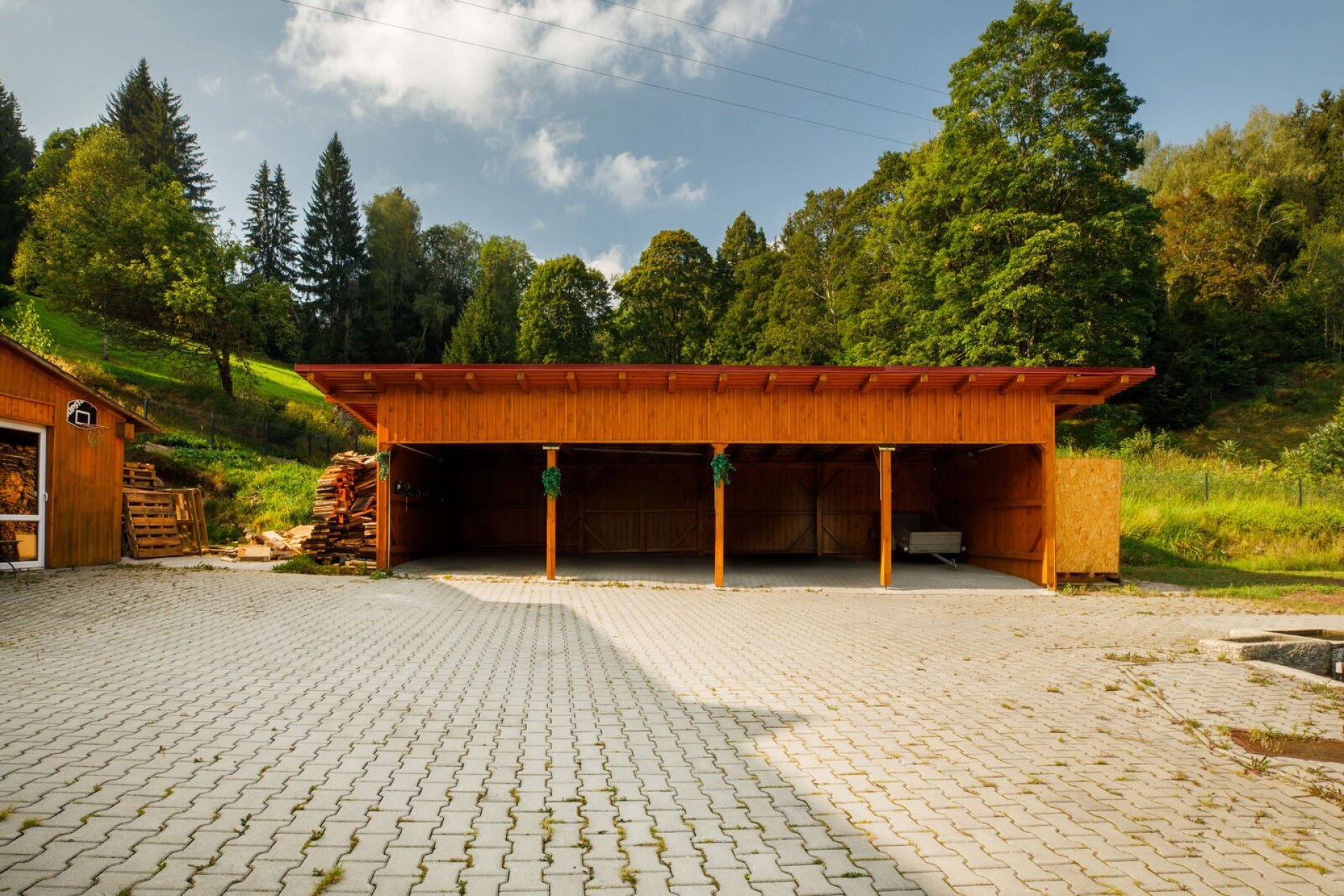 K domu přiléhá zastřešená terasa vhodná k příjemnému posezení. V zadní části zahrady se nachází prostorný dřevěný přístřešek ke stání aut. Na zahradě je také vodní nádrž s chovnými rybami. Vjezdová brána reaguje na dálkové ovládání prostřednictvím aplikace v telefonu.