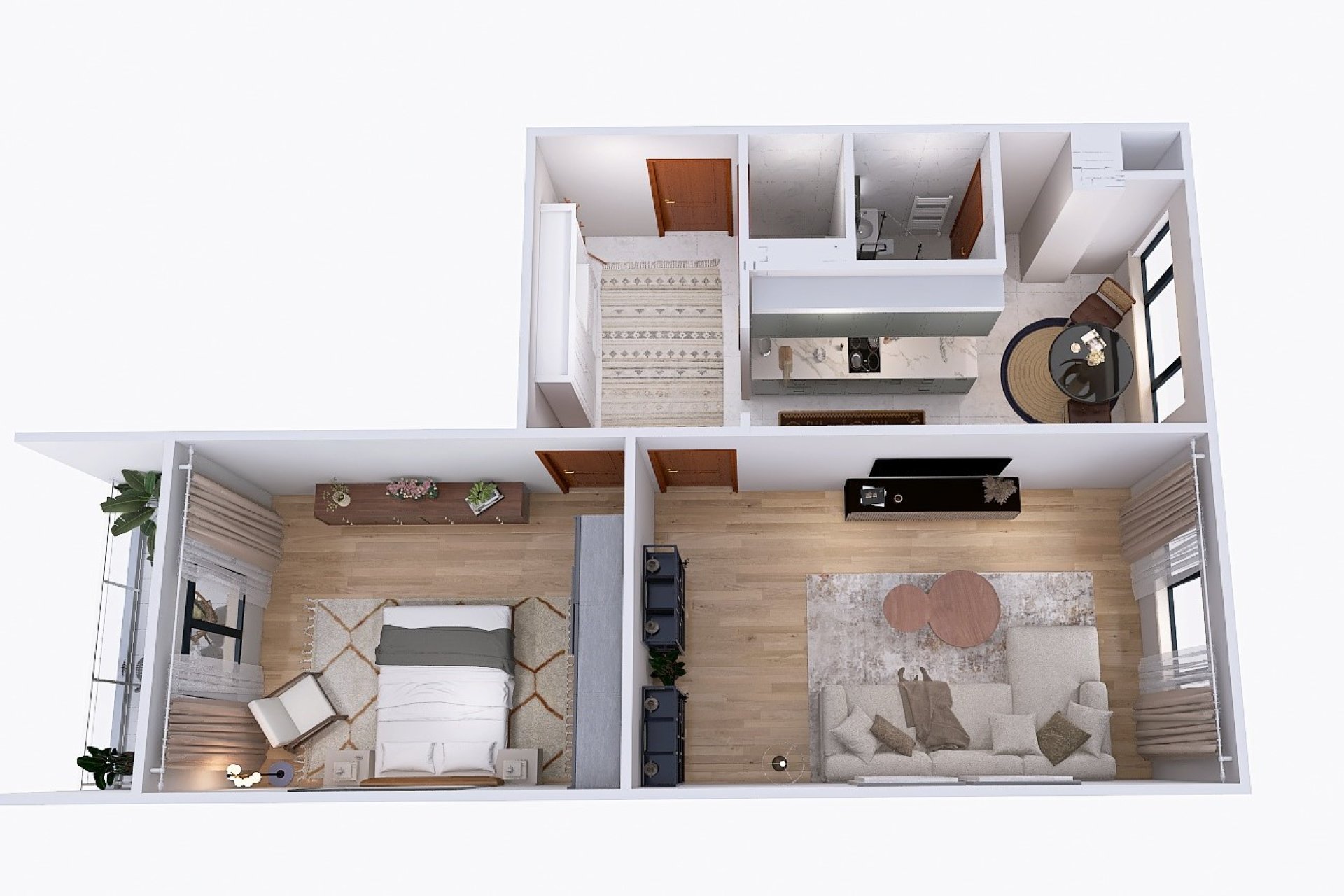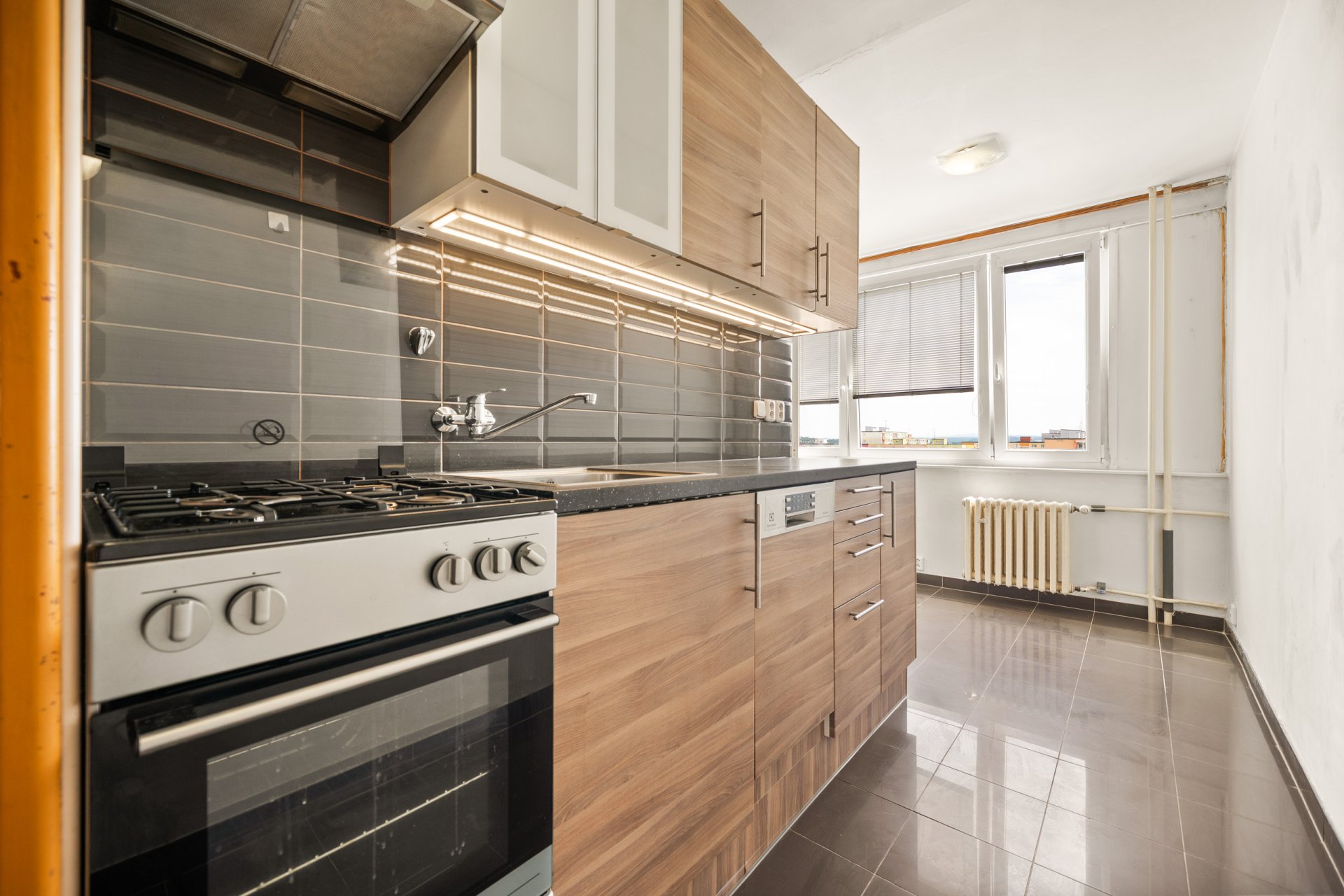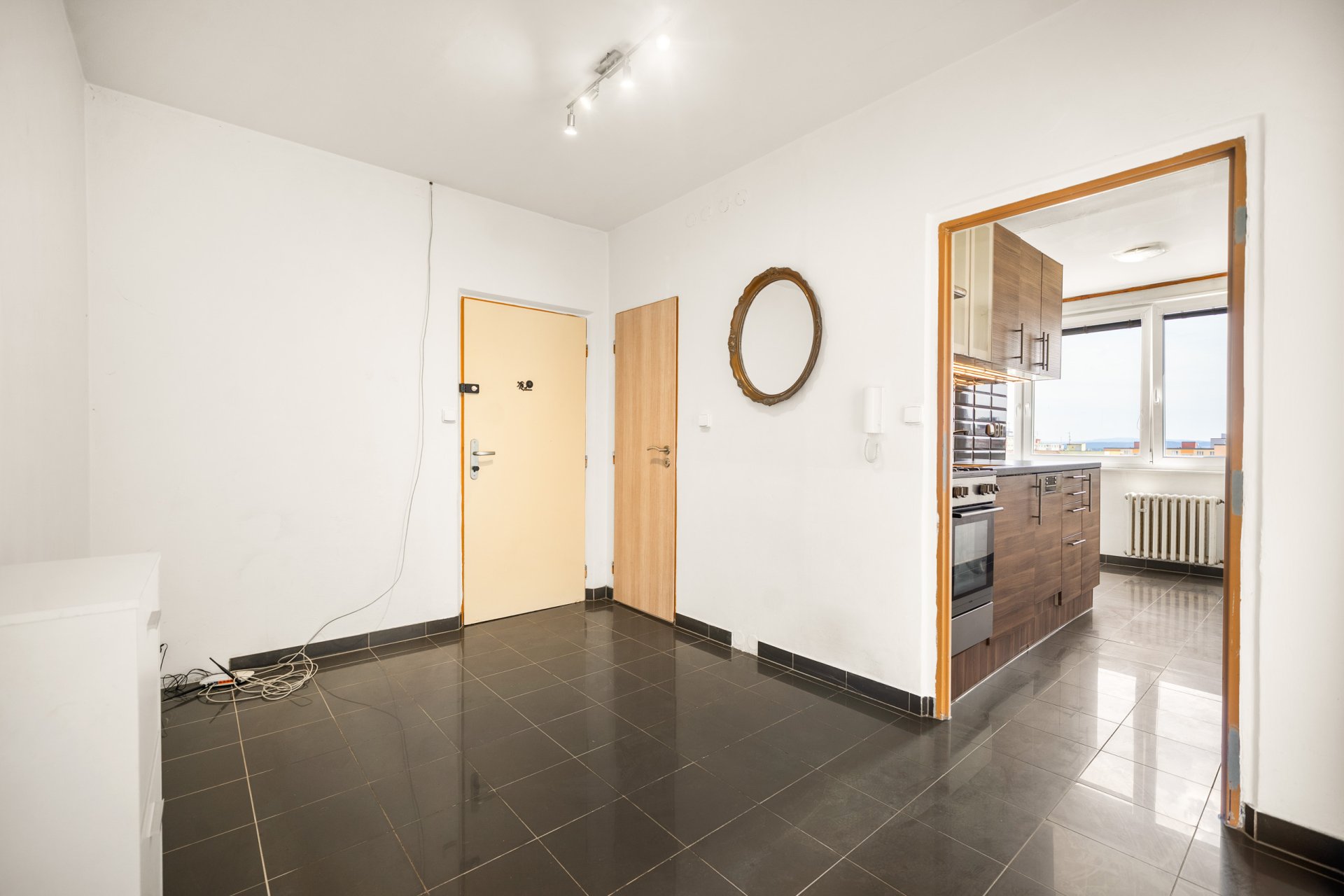 Byt disponuje prostornou vstupní předsíní, dvěma neprůchozími pokoji zajišťujícími dostatek soukromí a samostatnou kuchyní vybavenou plynovým sporákem a myčkou. Dále je zde koupelna a samostatné WC. Z ložnice je vstup na západně orientovanou lodžii s příjemným výhledem do okolí. Ostatní okna jsou orientována na východ, což zajišťuje dostatek denního světla po celý den.