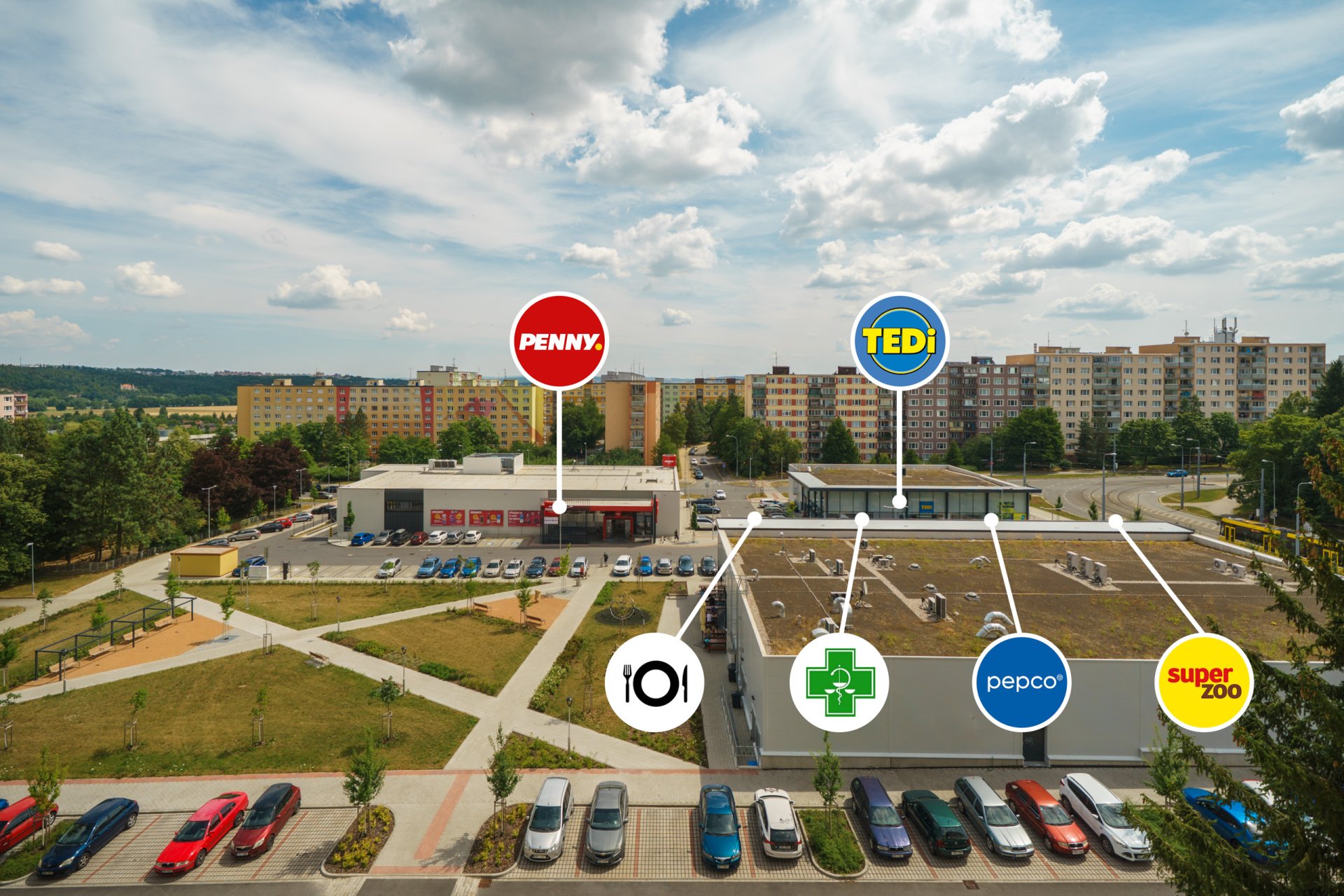 Byt se nachází v lokalitě s kompletní občanskou vybaveností v docházkové vzdálenosti. Přímo před domem je supermarket Penny, prodejny Pepco a Tedi, lékárna, Super Zoo a oblíbená restaurace. V blízkosti se nachází základní a mateřská škola, dětská hřiště a z druhé strany domu udržovaný park s workoutovým hřištěm, ideální pro sport i relaxaci. V širším okolí je pošta, supermarkety Albert a Lidl a další obchody a služby.